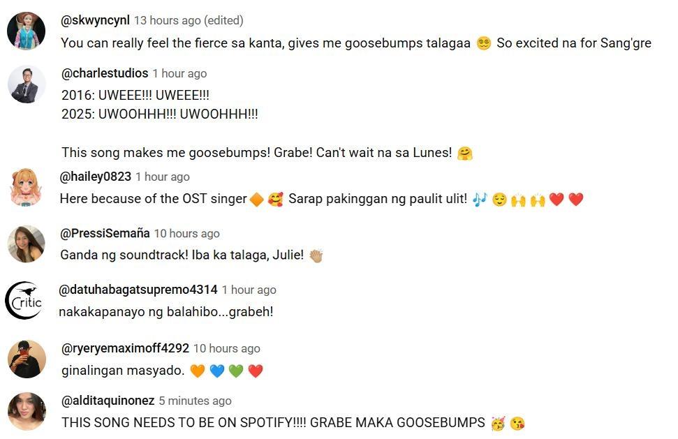 Ilan sa papuring natanggap ng official soundtrack at nang makapanindig balahibong pagkakaawit dito ni Julie Anne ay "goosebumps" at "sarap pakinggang ng paulit-ulit."
