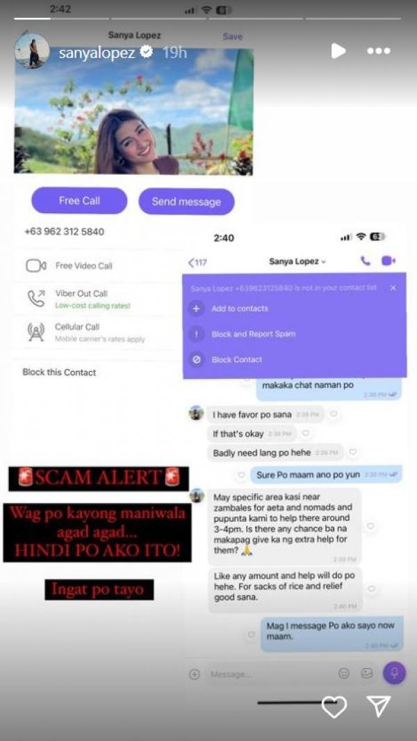Unang nag-post ang aktres ng Instagram Story ng screenshot ng message exchange sa pagitan ng nagpapanggap na si Sanya, at ng isang netizen gamit ang isang messaging app. Sa message, makikita na nanghihingi ang scammer ng donasyon para sa mga Aeta sa Zambales.