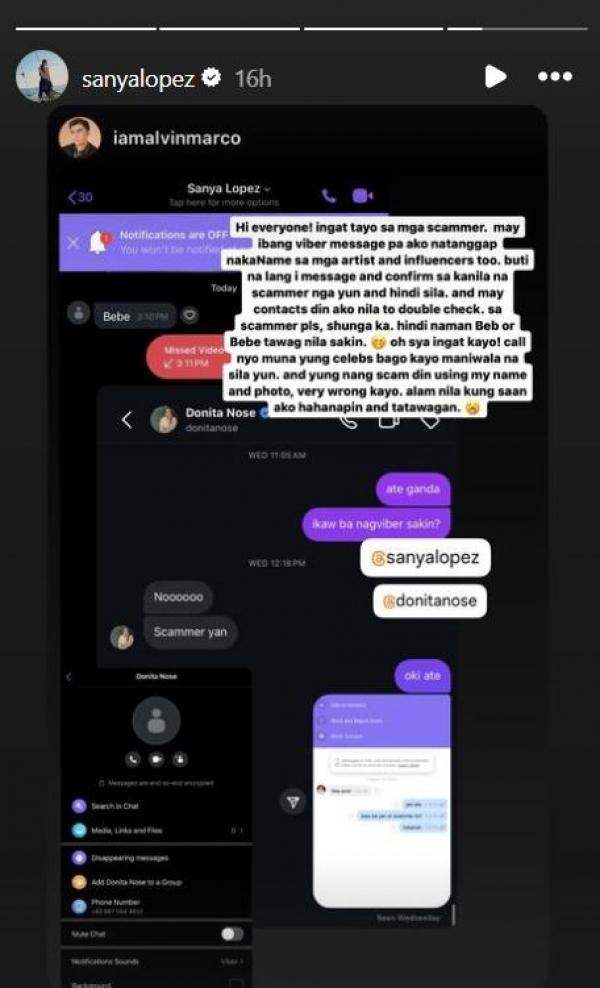 Kasama rin nito ang screenshot ng profile ng user na nagpapakita ng litrato ni Sanya. Naglagay naman ang aktres ng “Scam Alert” na warning sa kaniyang post, at nagpaalala na 'wag maniniwala agad sa mga ganitong mensahe.