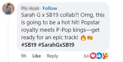 A Facebook user commented, "Sarah G x SB19 collab?! Omg, this is going to be a hot hit! Popstar royalty meets P-Pop kings--get ready for an epic track! 🔥👑 #SB19 #SarahGxSB19."