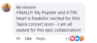"FINALLY! My Popster and A'TIN heart is freakiiiin' excited for this! Tapos concert soon - I am all seated for this epic collaboration," the comment read.