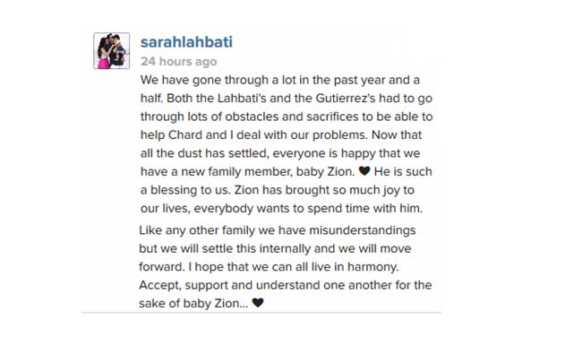 @sarahlahbati, she said, “We have gone through a lot in the past year and a half. Both the Lahbati's and the Gutierrez's had to go through lots of obstacles and sacrifices to be able to help Chard and I deal with our problems.”