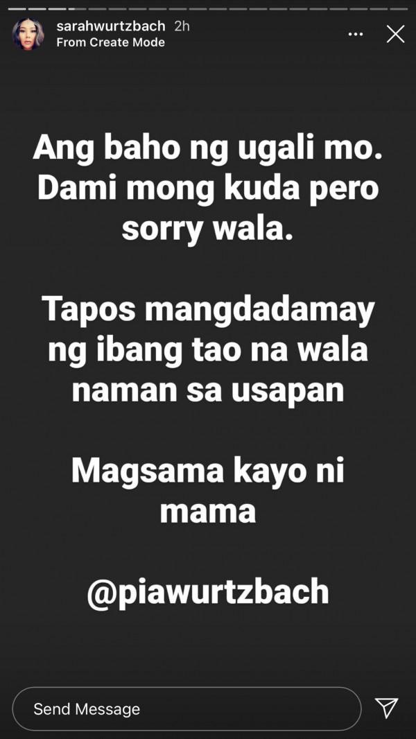 “Ang baho ng ugali mo,” wrote Sarah Wurtzbach towards former Miss Universe Pia Wurtzbach in a series of posts made on Instagram Story.