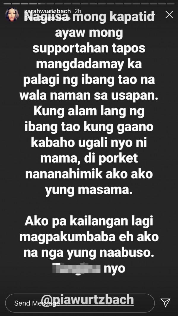 Trouble seems to be brewing in the family as Sarah Wurtzbach expressed her frustration over her elder sister, Miss Universe 2015 Pia Wurtzbach.