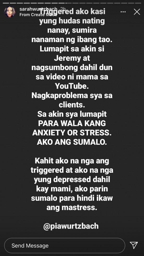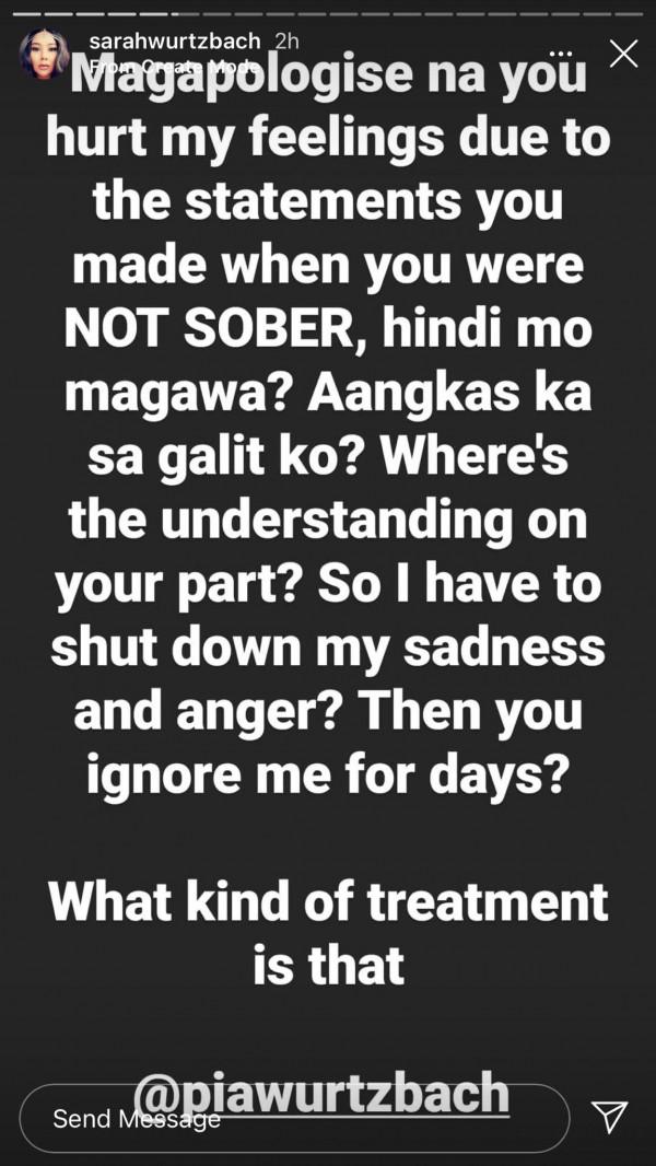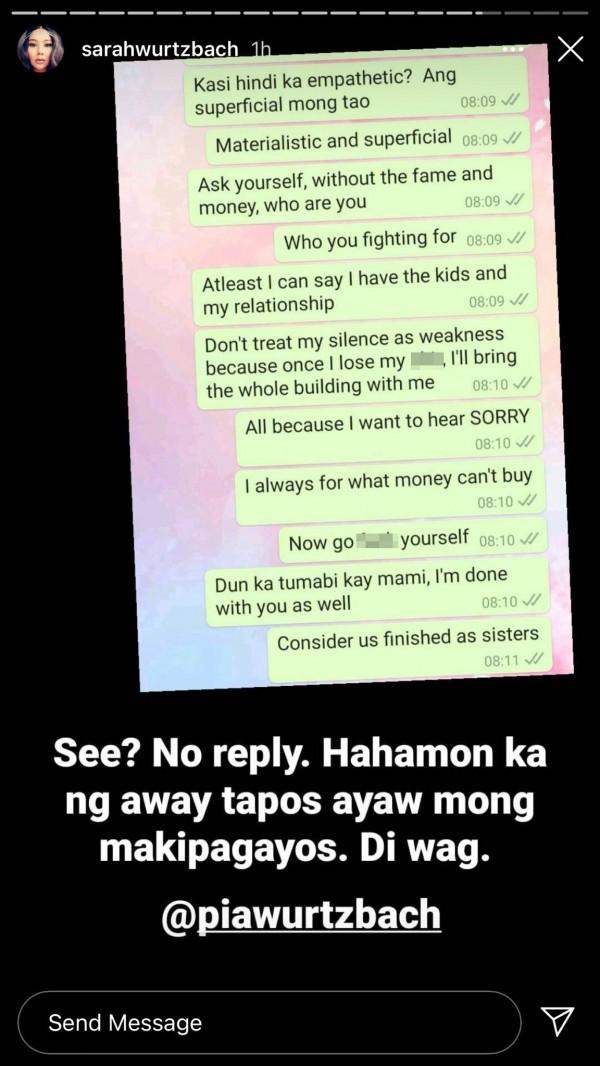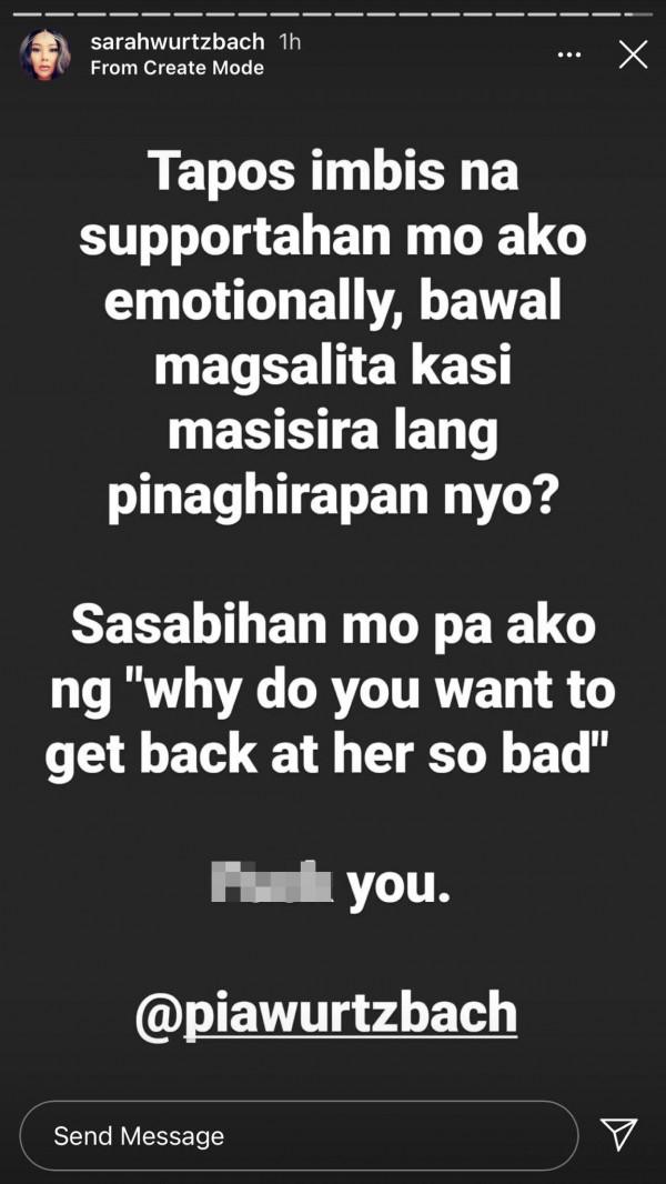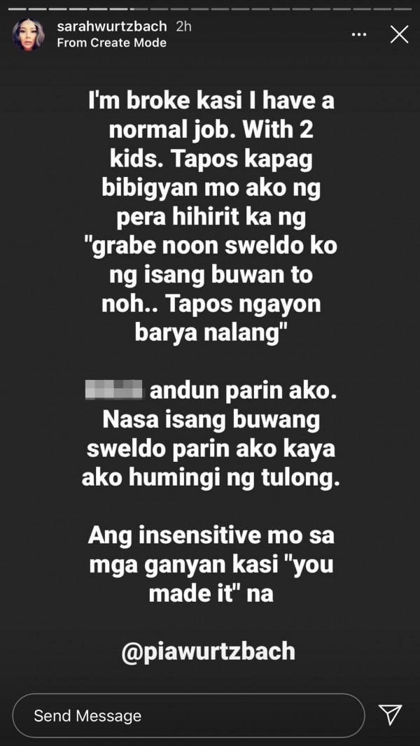“B**ch, andun pa rin ako. Nasa isang buwanang sweldo pa rin ako kaya ako humihingi ng tulong. Ang insensitive mo sa mga ganyan kasi 'you made it' na @piawurtzbach.”