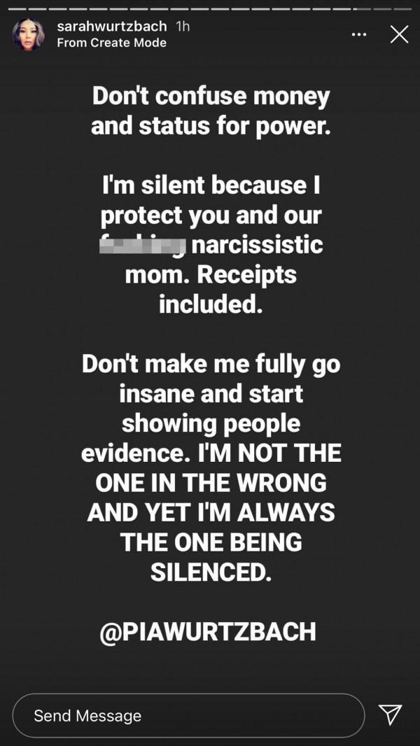 “I'm silent because I protect you and our f*cking narcissistic mom. Receipts included. Don't make me fully go insane and start showing people evidence. I'm not the one int he wrong and yet I'm always the one being silenced @piawurtzbach.”