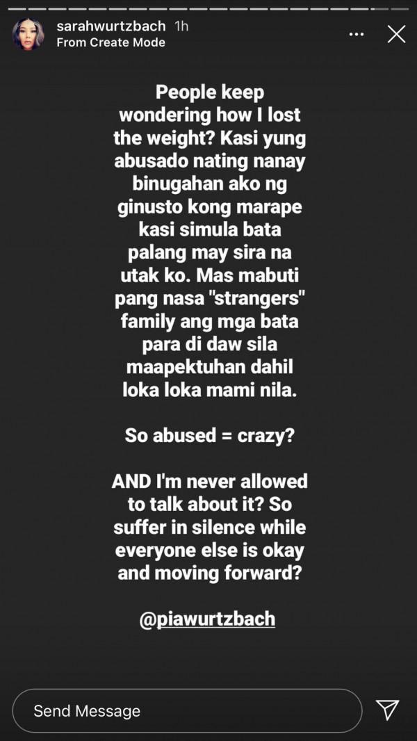 She cited, “Kasi 'yung abusado nating nanay binugahan ako ng gunusto kong ma-rape kasi simula bata pa lang may sira na utak ko. Mas mabuti pang nasa 'strangers' family ang mga bata para 'di daw sila maapektuhan dahil loka-loka mami nila.