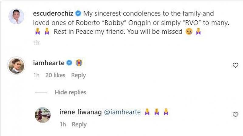 Meanwhile, Sen. Chiz took to Instagram to offer his condolences to the Ongpin family. Likewise, his wife Heart expressed her sadness by posting a crying emoji on its comment section.