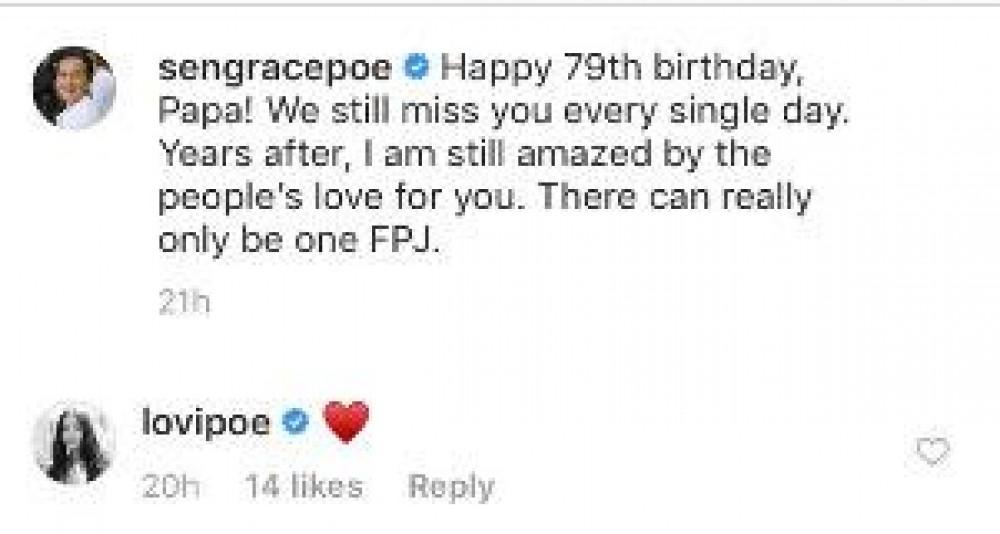 She posted, “Happy 79th birthday, Papa! We still miss you every single day. Years after, I am still amazed by the people's love for you. There can really only be one FPJ.”