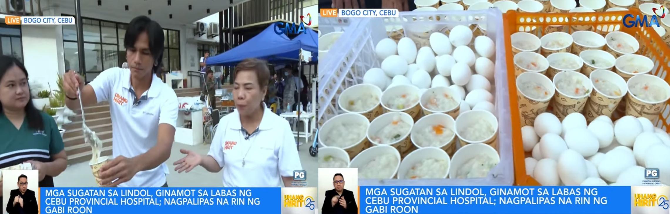 Amid the challenging conditions, Chef JR, who assisted in the distribution of hot meals, highlighted the efforts of hospital staff providing nourishment to patients. “Meron po tayong lugaw, care of ng ating magigiting na Nutrition and Dietetics Services Department ng Cebu Provincial Hospital. Sila po 'yung nagpapakahirap para makapagbigay ng libreng pagkain para sa mga pasyente,” he said.