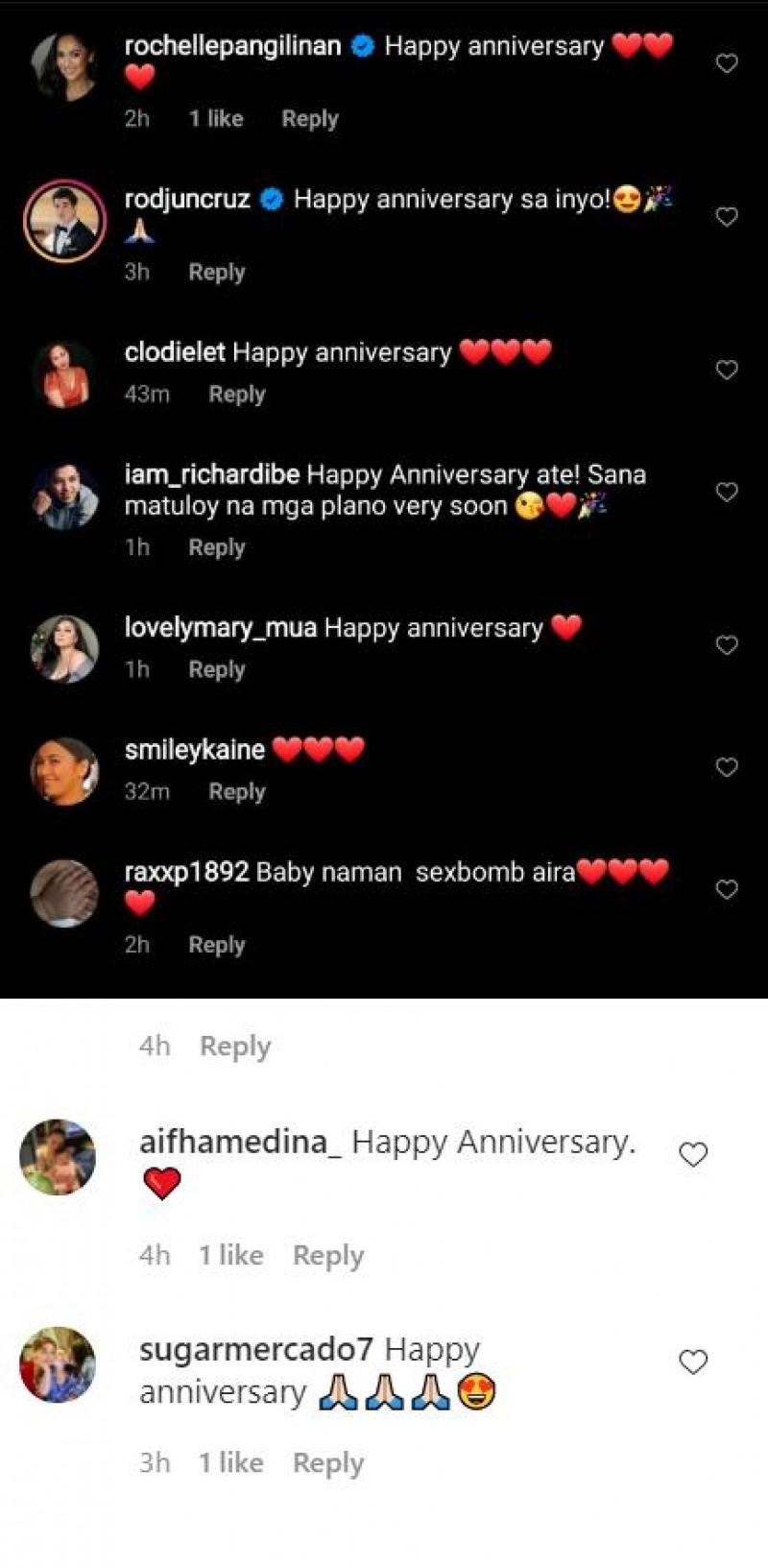 Several of Aira's friends in show business commented on her wedding anniversary post including Encantadia star Rochelle Pangilinan, Rodjun Cruz, and former Wowowin host Sugar Mercado.