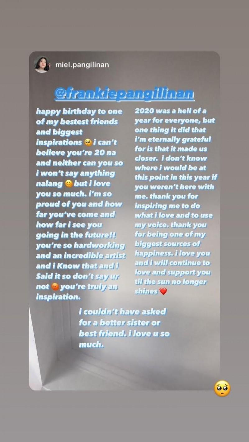 Frankie's younger sister Miel also penned a heartfelt dedication for her via her Instagram Story.