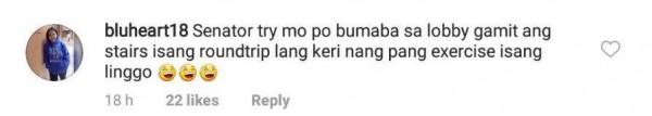 Payo naman ng isa, “Senator, try mo po bumaba sa lobby gamit ang stairs. Isang roundtrip lang keri na pang exercise isang linggo.”