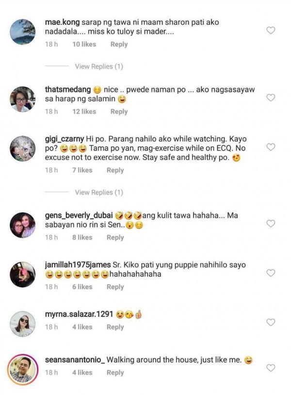 “At ganito po ngayon ang kanyang pag-exercise bilang may ECQ! Hahaha,” isinulat ni Sharon sa caption.