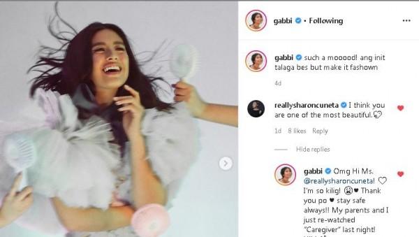 "Omg Hi Ms. @reallysharoncuneta! I'm so kilig! Thank you po, stay safe always! My parents and I just re-watched “Caregiver” last night," replied Gabbi.
