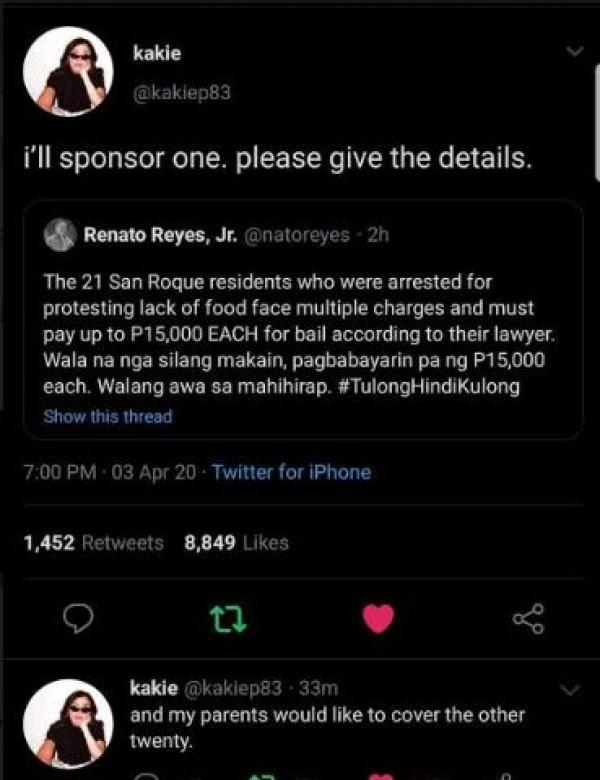 In a tweet, Sharon's daughter Frankie Pangilinan replied to a post by Bagong Alyansang Makabayan secretary general Renato Reyes Jr., saying that she and her parents are willing to shoulder the bail of the 21 people, which will amount to at least Php 15,000 each.