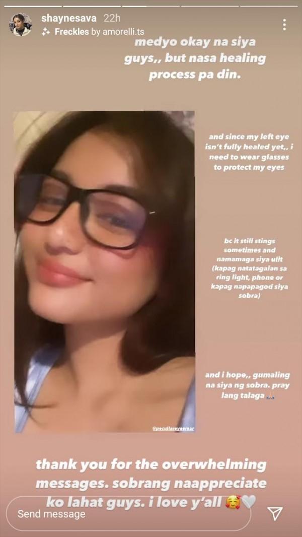 "It still stings sometimes and namamaga siya ulit kapag natatagalan sa ring light, phone or kapag napapagod siya ng sobra. I hope gumaling na siya ng sobra."