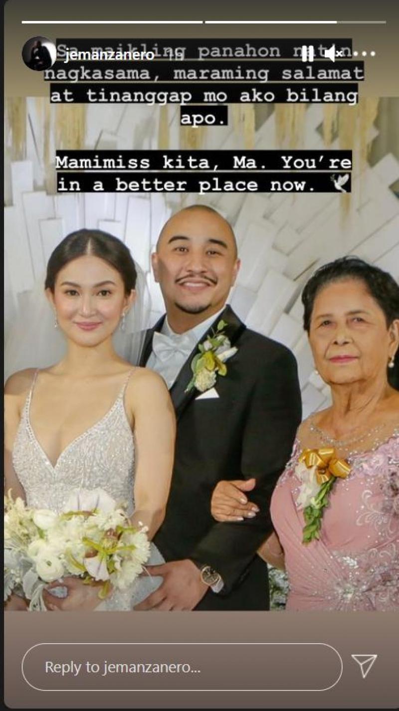 Meanwhile, her husband Atty. Jeron Manzanero took to Instagram Story to express his gratitude for his wife's grandmother for accepting him in their family.