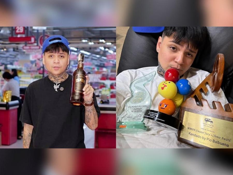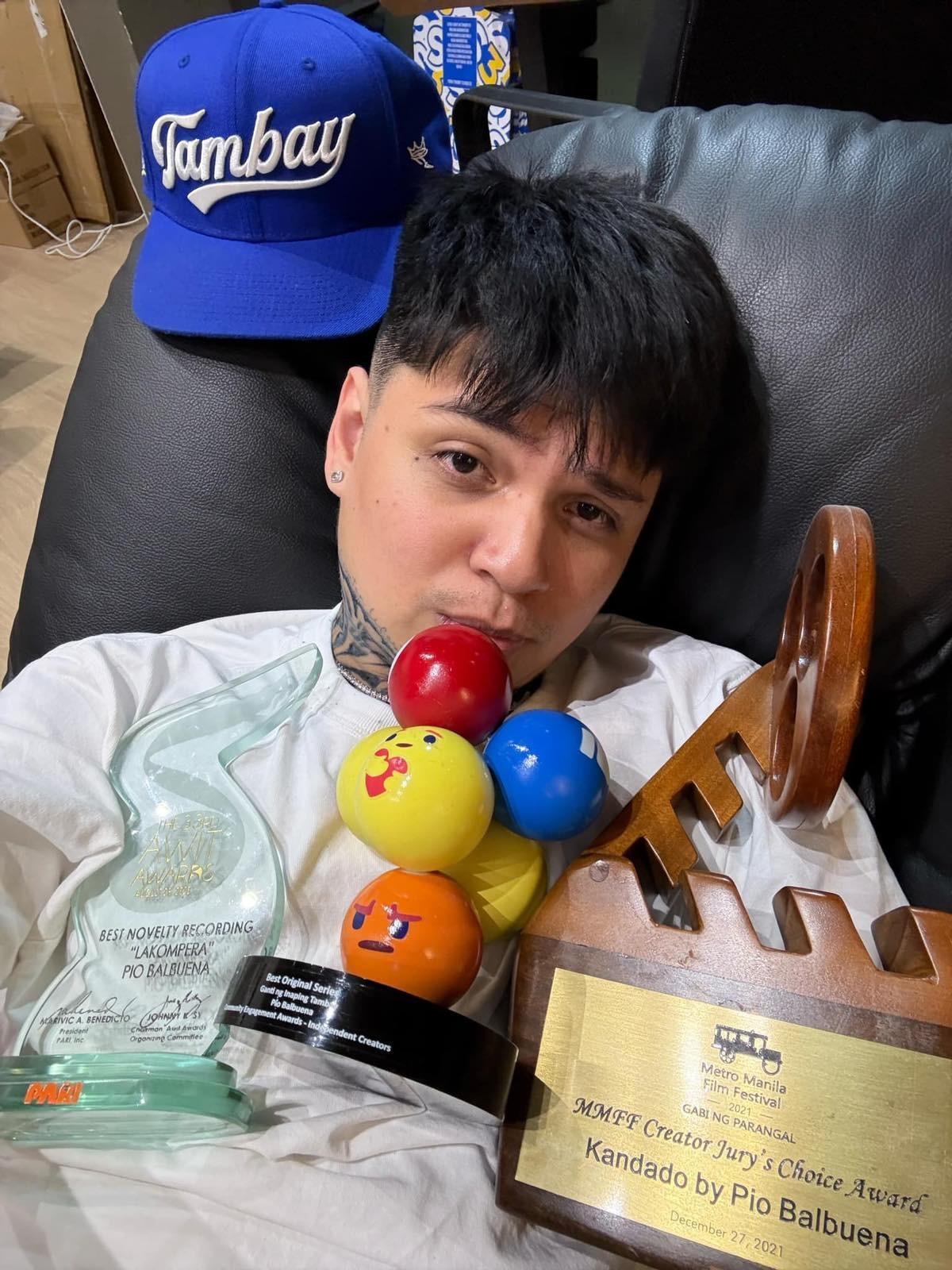 Singer-rapper-actor-director Pio Balbuena and his trophies (from left) Facebook, Awit Awards and Metro Manila Film Festival (MMFF).