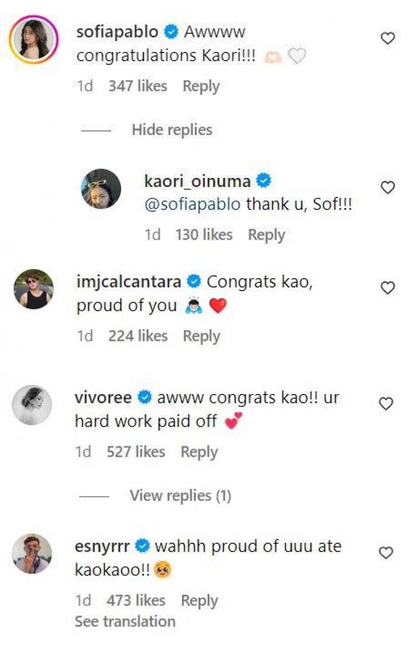 In the comment section, one of those who congratulated Kaori on her latest milestone is Open 24/7 star Sofia Pablo. The latter recently finished her junior high school at UST Angelicum.
