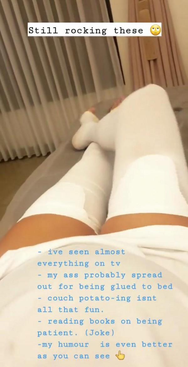 She said, "I've seen almost everything on TV. My ass probably spread out for being glued to bed. Couch potato-ing isn't all that fun. Reading books on being patient (Joke!)"