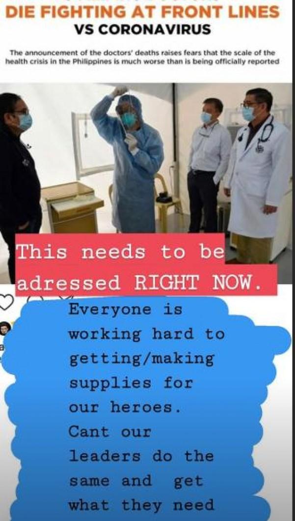 Ani ng aktres, "@DOHgovph why arent containers of PPE suits being ordered?? Why are civilians the ones finding ways to make some or aquire of some for our frontliners. Help us out here!"