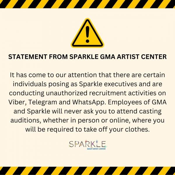 It has come to our attention that there are certain individuals posing as Sparkle executives and are conducting unauthorized recruitment activities on Viber, Telegram and WhatsApp. Employees of GMA and Sparkle will never ask you to attend casting auditions, whether in person or online, where you will be required to take off your clothes.