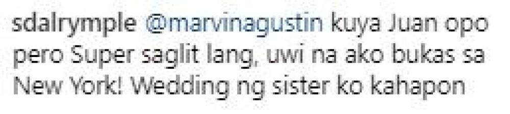 Serena replied, "Kuya Juan, opo, pero super saglit lang, uwi na ako bukas sa New York! Wedding ng sister ko kahapon." Juan is the name of Marvin Agustin's character in the movie they starred in together with Philippine Comedy Queen Aiai Delas Alas.