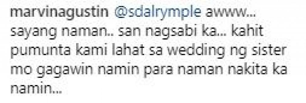 "Awww... sayang naman.. sana nagsabi ka... kahit pumunta kami lahat sa wedding ng sister mo gagawin namin para naman nakita ka namin..."