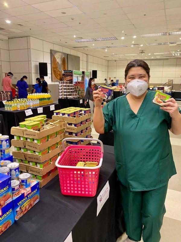A medical frontliner grabs free grocery items at the St. Luke's Care Store | Photo by: StLukesPH (FB)