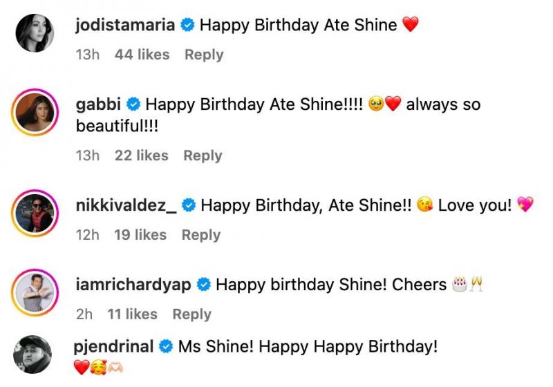 “Happy Birthday Ate Shine!!!! [A]lways so beautiful!!!” Gabbi Garcia said, while Richard Yap wrote, “Happy birthday Shine! Cheers.”