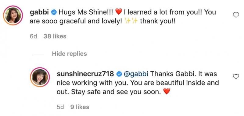 Sa post na ito ng aktres agad naman na nagkumento ang bida ng serye na si Gabbi Garcia. "Hugs Ms Shine!!! I learned a lot from you!! You are sooo graceful and lovely! thank you!!" aniya.