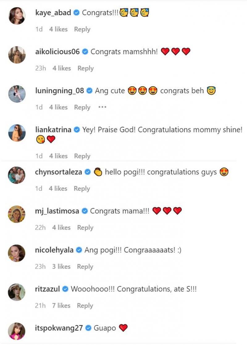 Aside from congratulations from her Instagram followers, Sunshine also received messages from celebrity friends, including Kaye Abad, Lian Paz, Chynna Ortaleza, MJ Lastimosa, Nicole Hyala, Ritz Azul, and Pokwang.