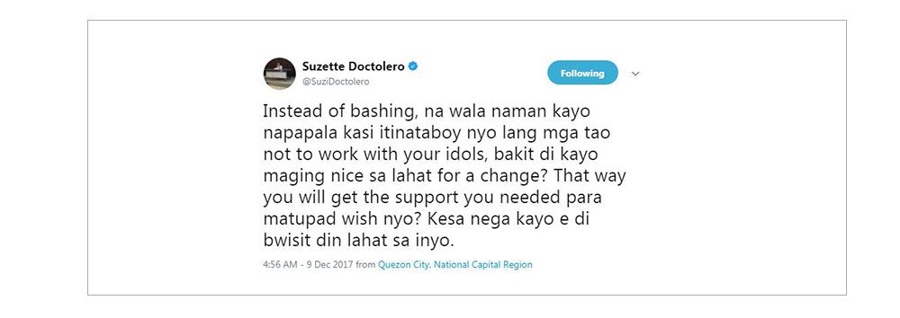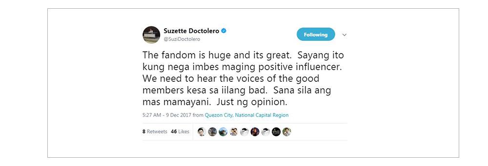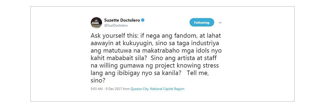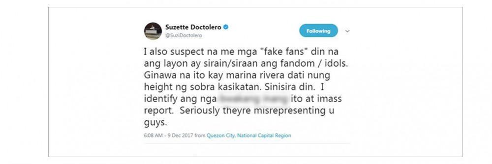 Naniniwala rin si Doctolero na mayroong fake fans na ang tanging layunin ay sirain ang fandom at ang reputasyon ng mga artista.