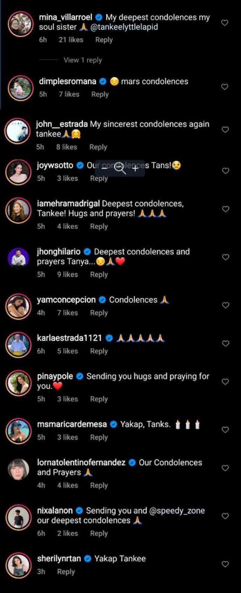 Several celebrities extended their condolences to Tanya's family including her Babawiin Ko Ang Lahat co-stars Carmina Villarroel and John Estrada.