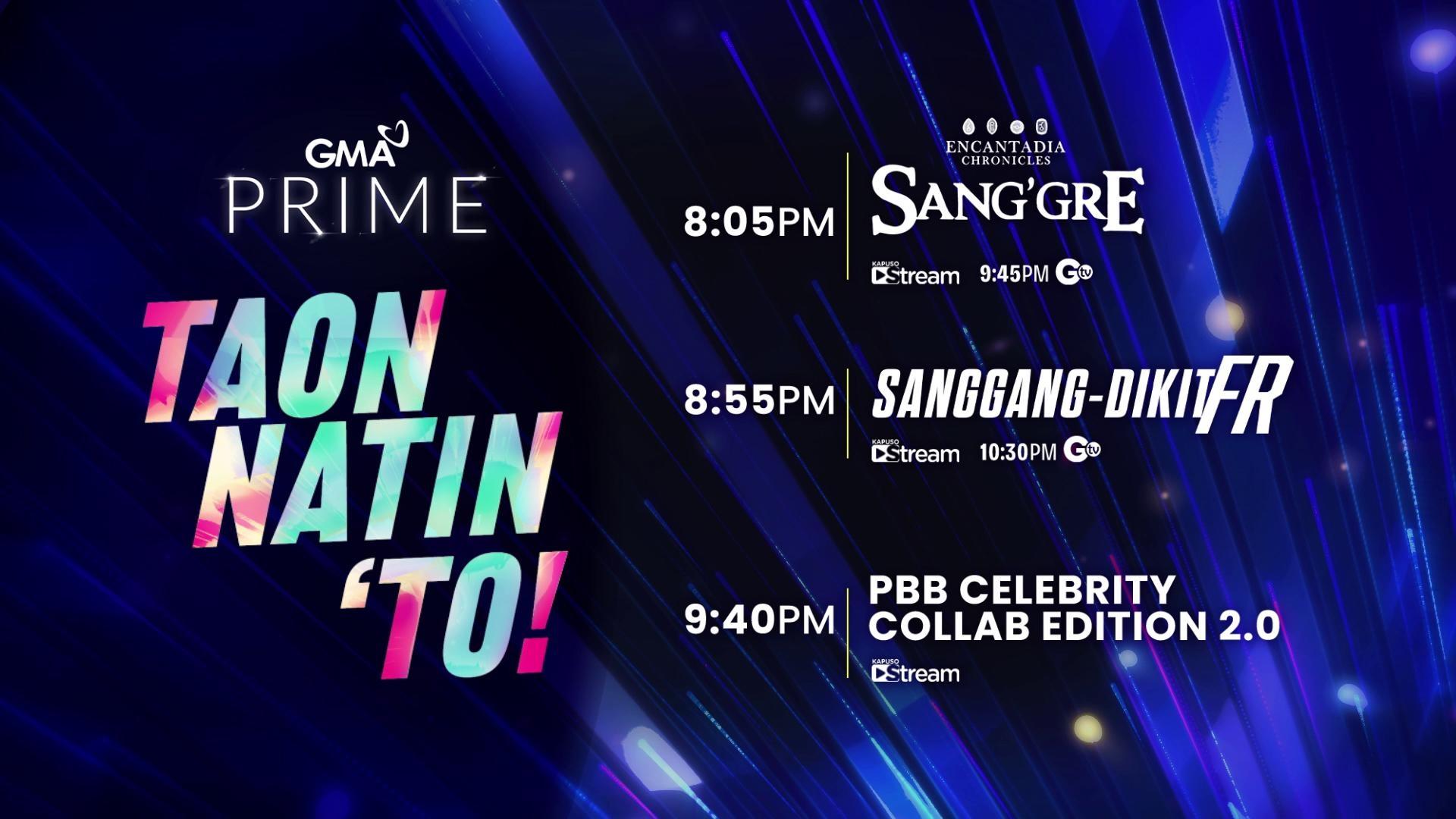 Patuloy na panoorin ang Encantadia Chronicles: Sang'gre, 8:05 p.m., Sanggang Dikit FR, 8:55 p.m., at Pinoy Big Brother Celebrity Collab Edition 2.0, 9:40 p.m. sa GMA Prime.