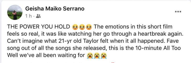 "THE POWER YOU HOLD. The emotions in this short film feel so real, it was like watching her go through heartbreak again. Can't imagine what 21-yr old Taylor felt when it all happened. Fave song out of all the songs she released, this is the 10-minute All Too Well we've all been waiting for," one netizen named Geisha Serrano posted on Facebook.