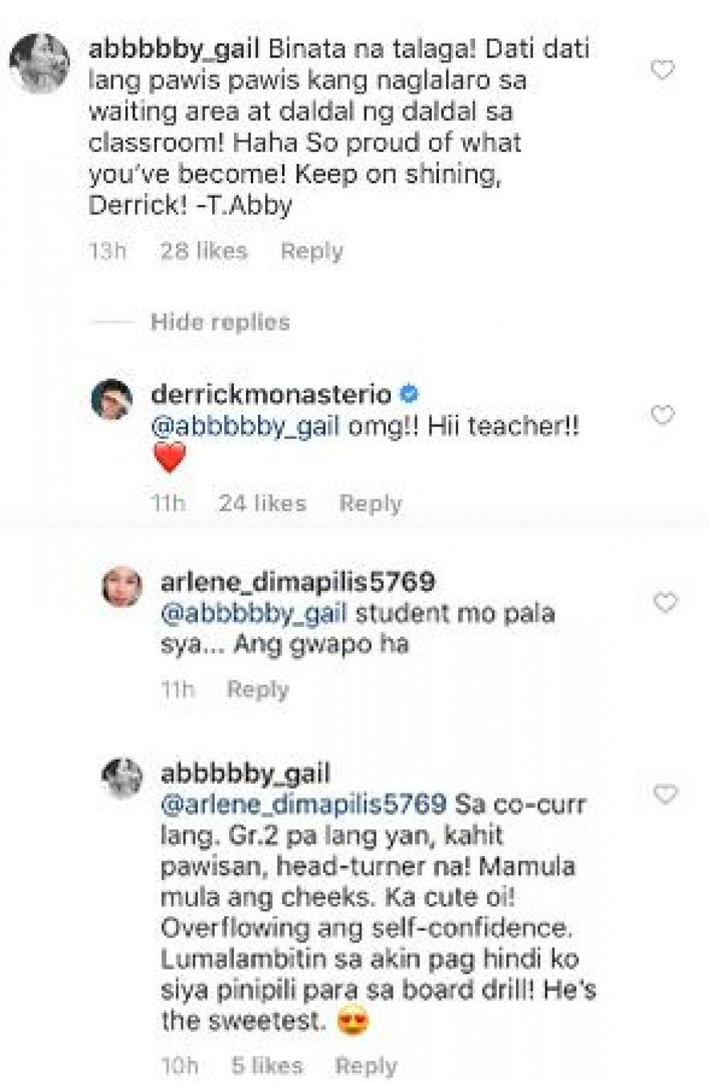 Teacher Abi Gail to her ex-student Derrick Monasterio: "So proud of what you've become"