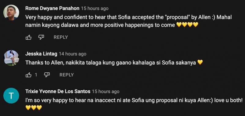 "Very happy and confident to hear that Sofia accepted the "proposal" by Allen [smiling emoji] Mahal namin kayong dalawa and more positive happenings to come," comment ng isang fan.