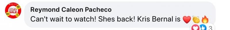 Aniya, "Can't wait to watch! She's back! Kris Bernal is [fire emoji]."