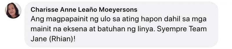 "Ang magpapainit ng ulo sa ating hapon dahil sa mga mainit na eksena at batuhan ng linya. Siyempre Team Jane (Rhian)!" komento ng netizen.