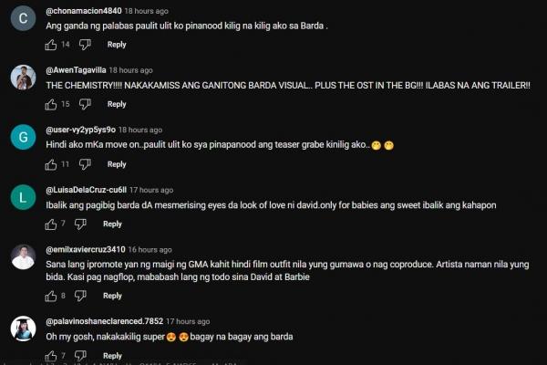 Komento naman ng isang netizen, “Ibalik ang pag-ibig BarDa [the] mesmerising eyes [the] look of love ni David. Only for babie's. Ang sweet ibalik ang kahapon.”