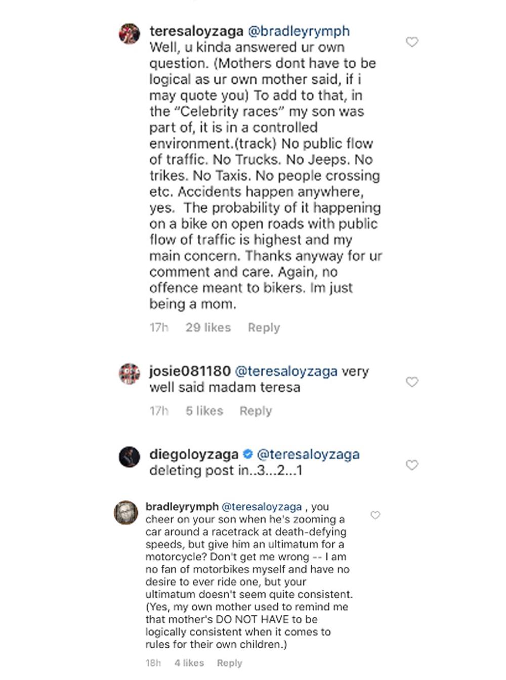 Isa namang netizen ang nagkomento sa Instagram page ni Diego at diretsahang tinanong si Teresa kung bakit ayaw niya payagan ang anak na sumakay sa motorbike, pero hinahayaan ito sumali sa mga car race.