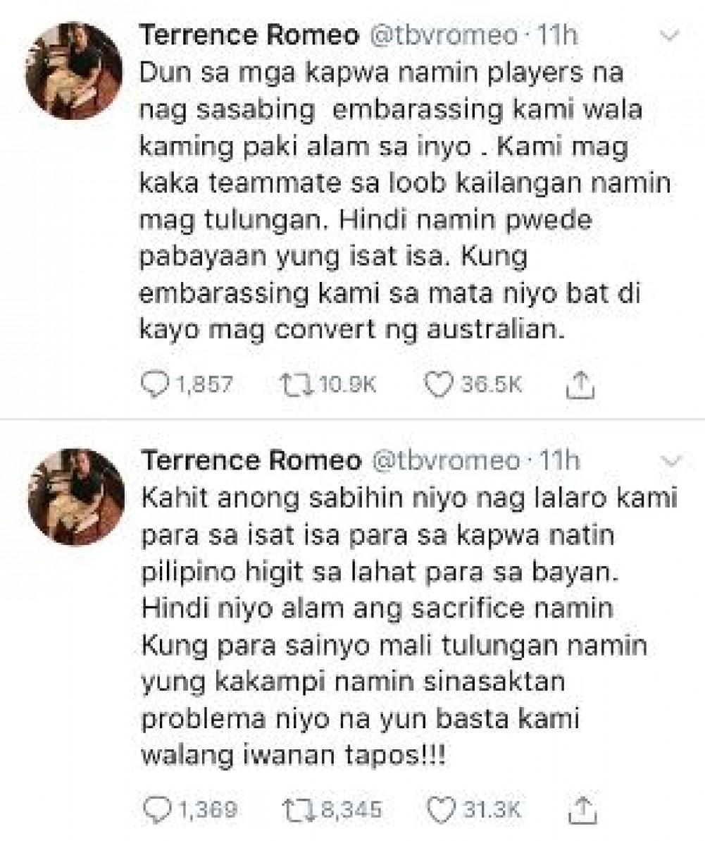 Palaban ang naging tugon ni Terrence Romeo sa Twitter sa mga taong disappointed sa buong national team sa FIBA World Cup game.
