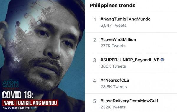 The Atom Araullo Specials 'COVID-19: Nang Tumigil Ang Mundo' is Twitter Philippines's top trending topic on May 31