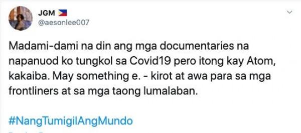 In the documentary, Atom examined how the COVID-19 pandemic changed the lives of Filipinos here and abroad.