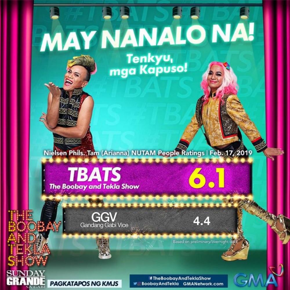 Winner na talaga ang Sunday night natin, mga ka-TBATS, dahil waging-wagi sa TV ratings ang The Boobay and Tekla Show.