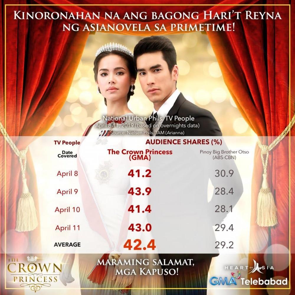 Ayon sa National Urban Phils. TV People, wagi ang The Crown Princess sa average week ratings nito mula April 8 hanggang April 11.