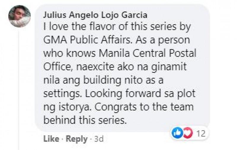 One netizen said, "I love the flavor of this series by GMA Public Affairs. As a person who knows Manila Central Postal Office, na-excite ako na ginamit nila ang building nito as a setting. Looking forward sa plot ng istorya. Congrats to the team behind this series."