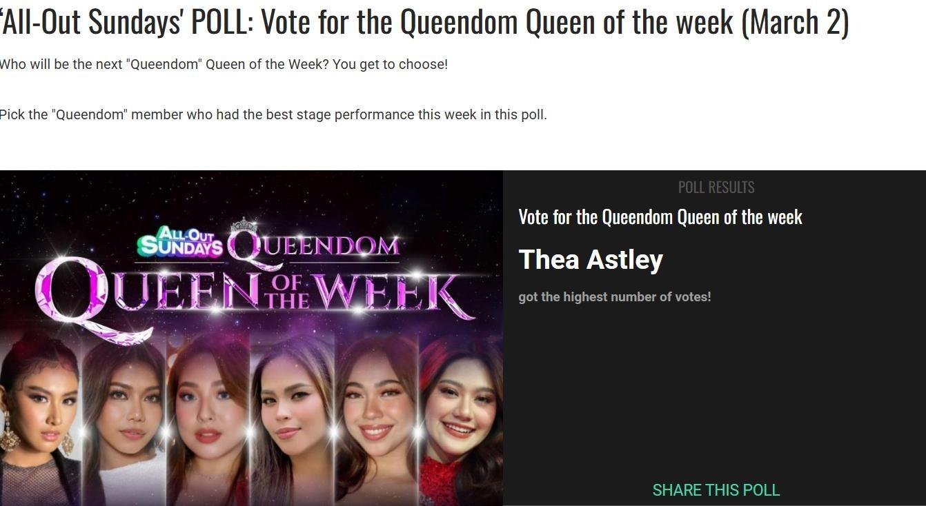 Thea previously reigned as the most voted Queendom Diva of the Week during the January 19 and February 2 airing of All-Out Sundays.